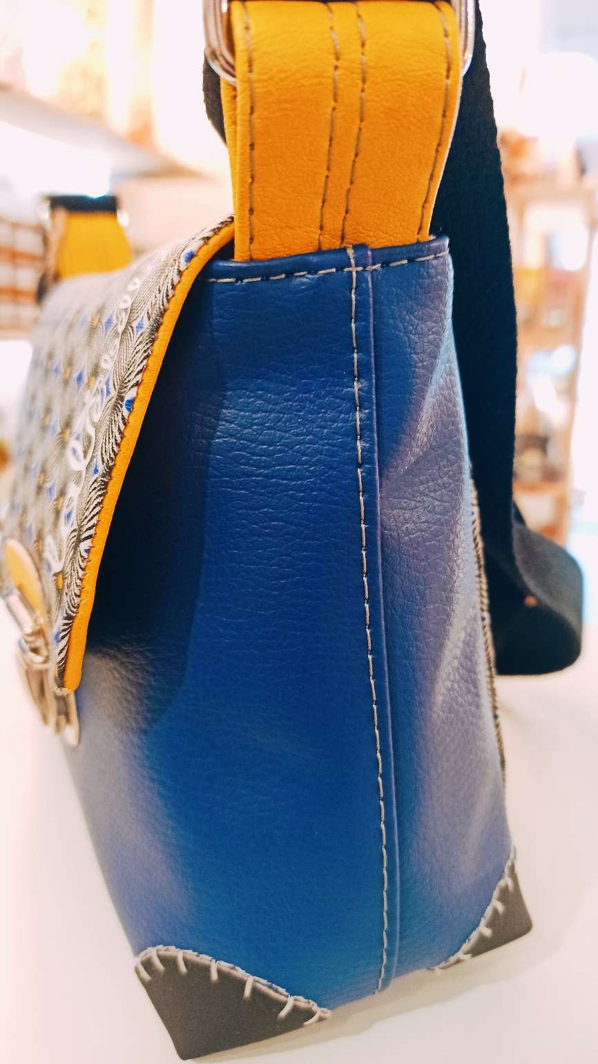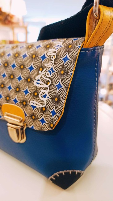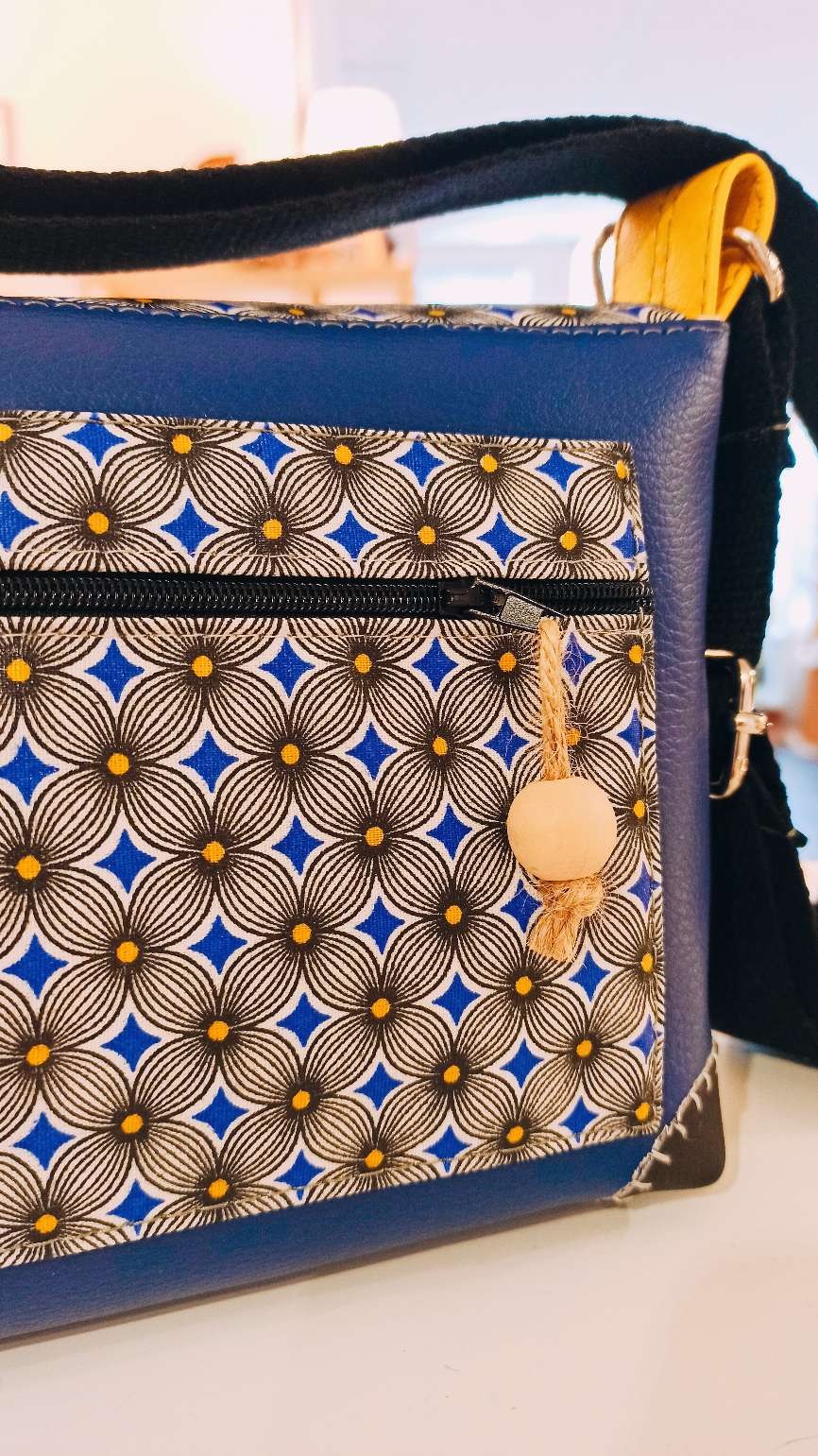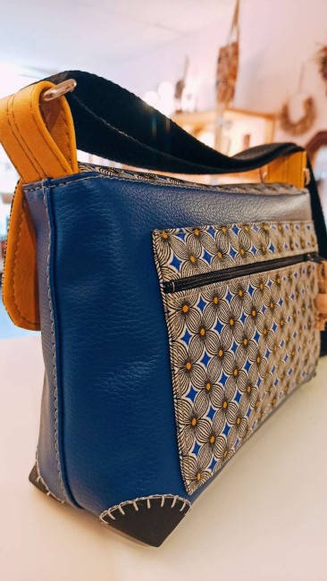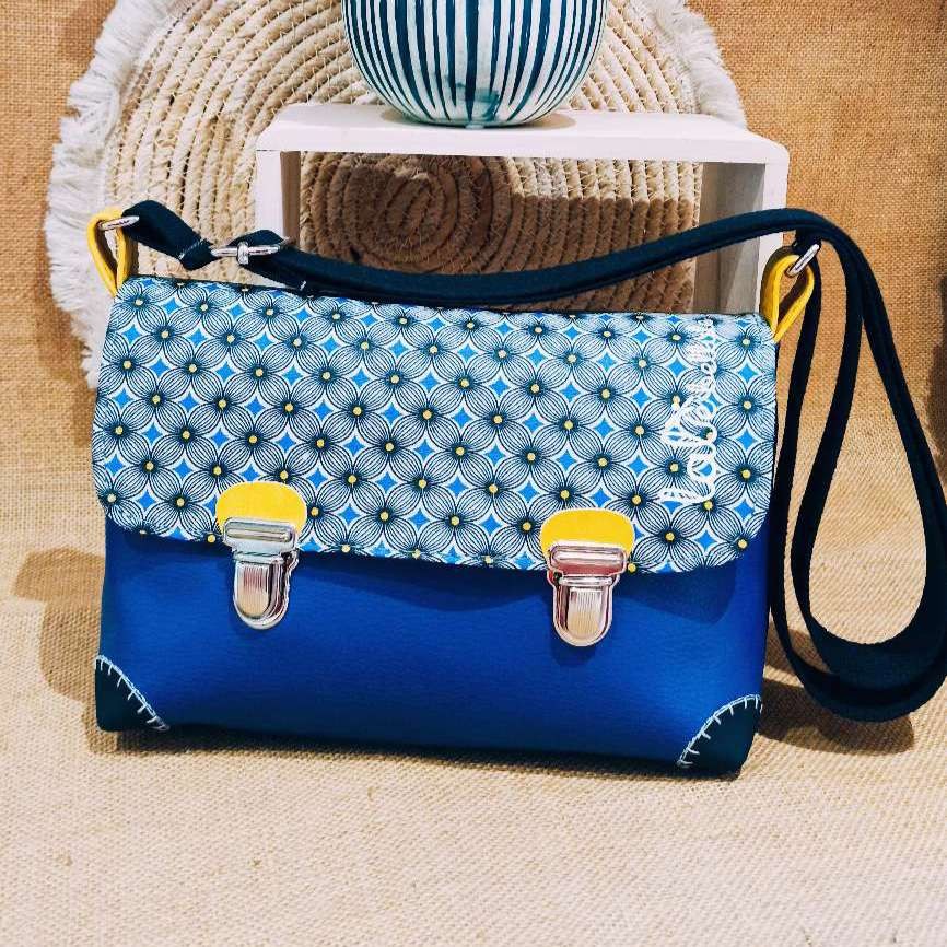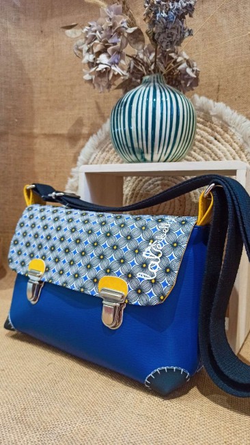 Base en simili cuir bleu éléctrique et coton imprimé formes géométriques tons noir/jaune et bleu.